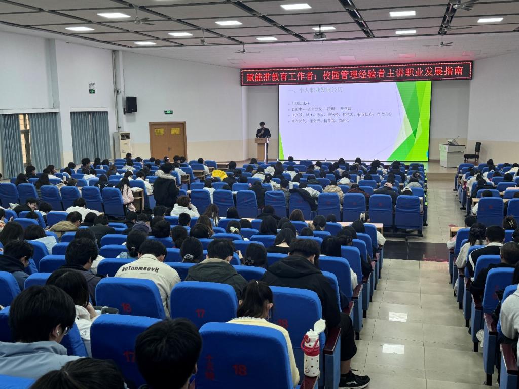 2025年11月5日,宝盈集团bbin直营网“企业专家进校园”系列主题就业讲座在学校报告厅成功举办。本次讲座特邀临榆中学校长赵东华担任主讲嘉宾,以“赋能准教育工作者:校园管理经验者主讲职业发展指南”为主题,面向学院大二、大三师范生开展就业指导,300余名学生到场聆听。