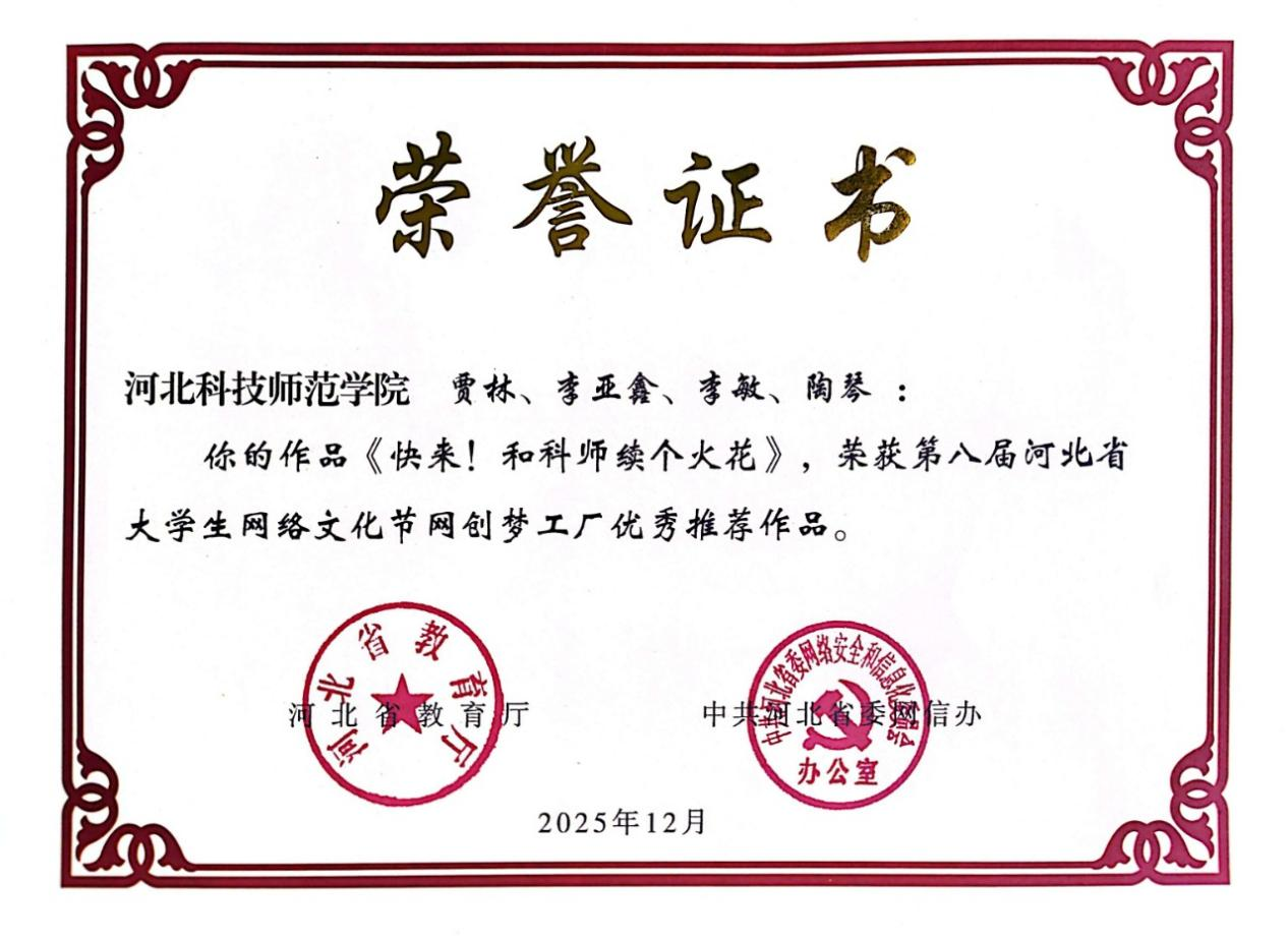 近日,由河北省教育厅、中共河北省委网信办联合举办的第八届河北省大学生网络文化节评选结果正式揭晓。宝盈集团bbin直营网选送的作品《快来!和科师续个火花》在“网创梦工厂”赛道中表现优异,成功获评省级优秀推荐作品。
